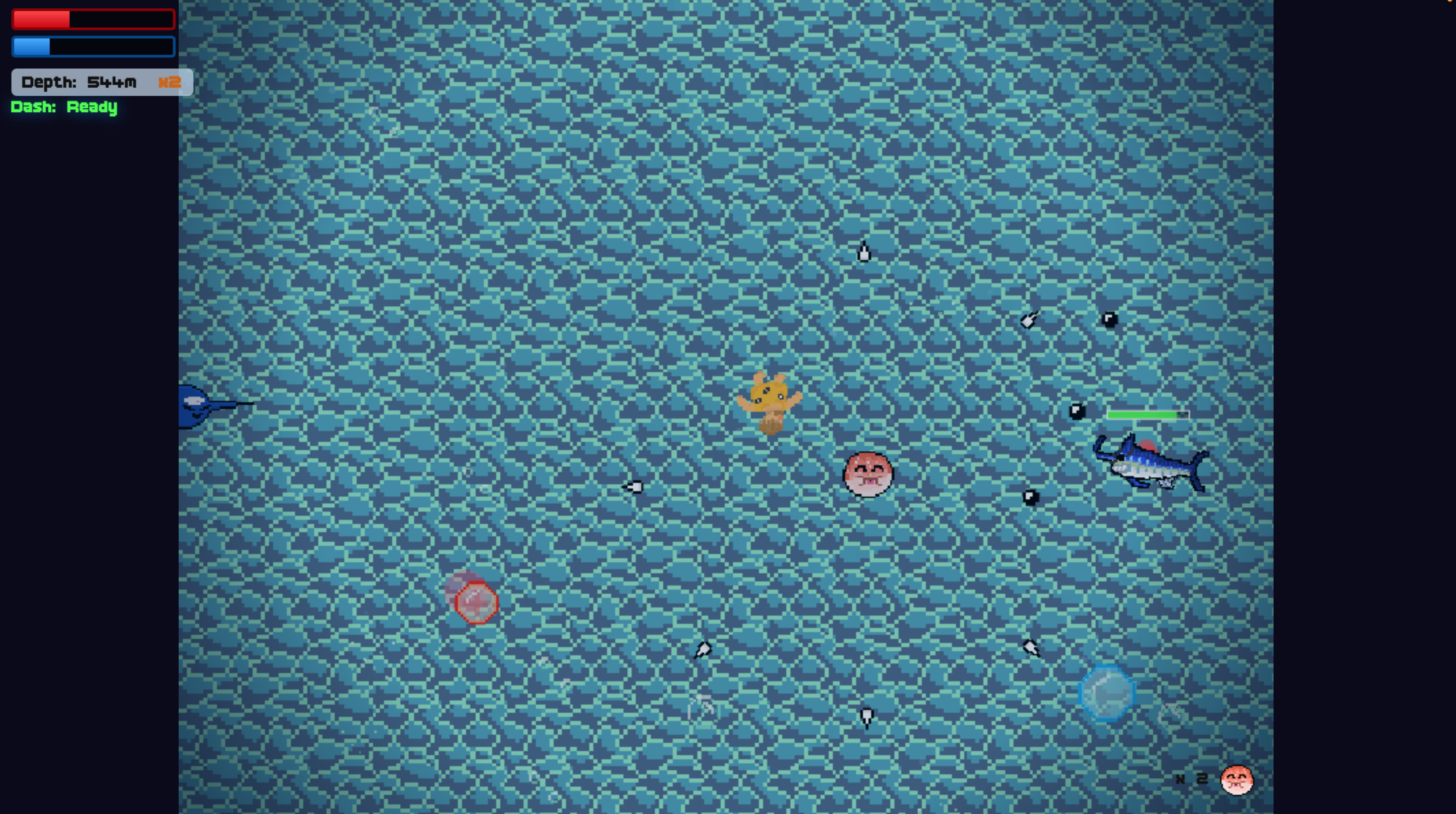 Survive as long as you can while descending into the depths. Dodge the relentless chaser fish, avoid pufferfish spike barrages, evade "sword"fish bullets, and escape hungry piranha swarms. Every 500m, face off against the Swordfish Captain — a boss that circles you and fires shotgun spreads of bullets. The only way to defeat him? Lure him into other hazards!
